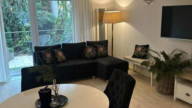 Das Apartment verfügt über ein gemütliches Schlafzimmer, in dem Sie sich nach einem langen Tag entspannen können. Das Badezimmer ist modern und gut ausgestattet, und es werden Bettwäsche und Handtücher bereitgestellt. Der Flachbild-TV und der Essbereich bieten Unterhaltung und Komfort. Die voll ausgestattete Küche ermöglicht es Ihnen, Ihre eigenen Mahlzeiten zuzubereiten und den Aufenthalt noch angenehmer zu gestalten. Von der Terrasse aus haben Sie einen wunderschönen Blick auf die Stadt.
