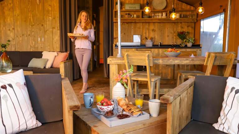 Das Luxe Glamping Zelt bietet komfortable und gut ausgestattete Unterkünfte mit einem Balkon, kostenfreiem WLAN und einem Flachbild-TV. Jedes Zelt verfügt über einen Sitzbereich, eine voll ausgestattete Küche mit Kühlschrank und Mikrowelle sowie ein eigenes Badezimmer mit Dusche. Ein Kochfeld, eine Kaffeemaschine und ein Wasserkocher sind ebenfalls vorhanden.