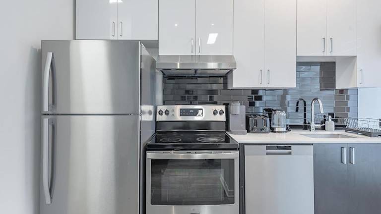 Die Ferienwohnung ist mit einer voll ausgestatteten Küche versehen, die unter anderem einen Kühlschrank und einen Geschirrspüler beinhaltet. Es stehen auch Haushaltsannehmlichkeiten wie ein Ofen und eine Kaffeemaschine zur Verfügung.