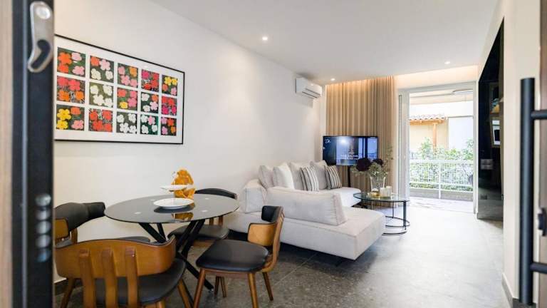 Die Ferienwohnung verfügt über ein Schlafzimmer und ist mit Klimaanlage, einem TV sowie einer Küche ausgestattet, die Kühlschrank und Geschirrspüler umfasst. In der Unterkunft steht zudem eine Autovermietung zur Verfügung.