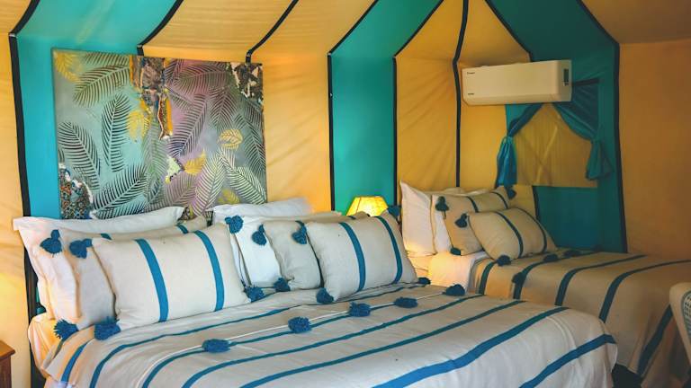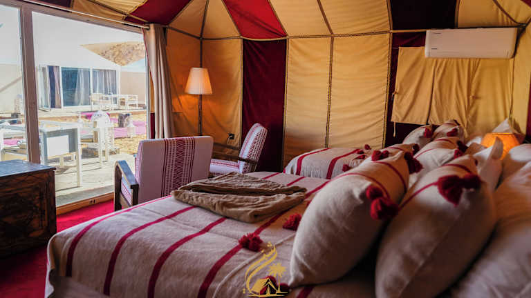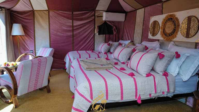 Das Luxury Camp Chebbi in Merzouga bietet seinen Gästen ein unvergessliches Erlebnis in der Wüste von Marokko. Mit einer Vielzahl von Annehmlichkeiten wie einer Terrasse, einer Bar und einem Restaurant können Sie hier eine entspannte Zeit verbringen. Das Camp liegt in der Nähe verschiedener Sehenswürdigkeiten und Aktivitäten wie dem Camel Trekking Company und der Geisterstadt. Genießen Sie jeden Morgen ein köstliches kontinentales Frühstück und profitieren Sie von der Möglichkeit zum Skifahren in der Umgebung.