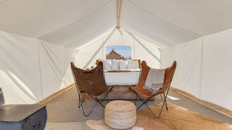 Das Hotel bietet luxuriöse Glamping-Zelte, die mit einem Bett, einem eigenen Bad und einer Sitzecke ausgestattet sind. Sie können zwischen einfachen Zelten mit Gemeinschaftsbad oder Zelt-Lodges mit Dusche, Waschbecken und Loungebereich mit Schlafsofa wählen. Die Zelt-Lodges verfügen über einen eigenen Patio/Veranda mit Liegestühlen, einem Keramikwaschbecken und Wellnessprodukten. Alle Zelte sind mit einer Laterne, Bettwäsche und Handtüchern ausgestattet.