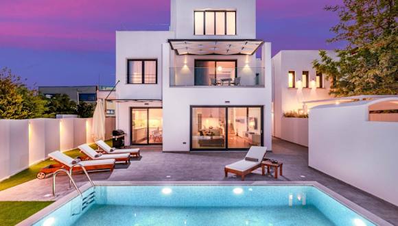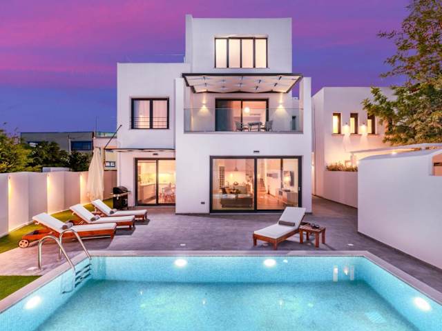Die 5star Villa Harmony w heated pool, Gym, Spa, Sauna ist mit einer Terrasse ausgestattet, die einen Blick auf die Berge und den Pool bietet. Zu den Annehmlichkeiten zählen ein ganzjährig geöffneter Außenpool, ein Fitnessraum, eine Sauna sowie ein Garten mit Grillmöglichkeiten.