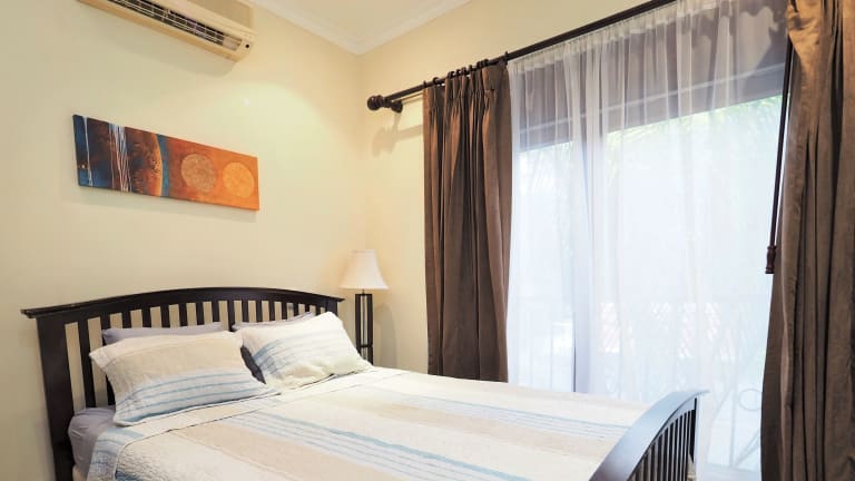 Die Ferienwohnung besteht aus zwei Schlafzimmern und einem Wohnzimmer. Sie ist mit Klimaanlage ausgestattet und umfasst eine voll ausgestattete Küche mit Kühlschrank und Wasserkocher. Die beiden Badezimmer sind mit einer Dusche sowie kostenlosen Pflegeprodukten ausgestattet. Handtücher und Bettwäsche werden bereitgestellt.