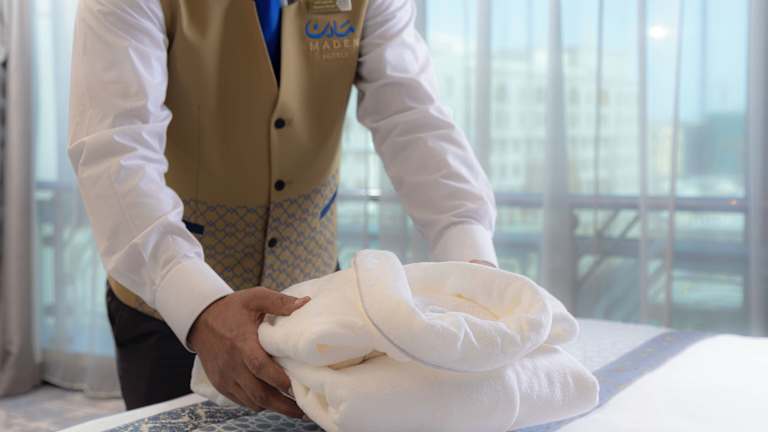 Das MADEN Hotel liegt 100 m von der Moschee Al Haram entfernt, in einer zentralen Lage mit guter Anbindung zum öffentlichen Transport. Der Flughafen Prinz Mohamed Bin Abdul Aziz ist nach 25 Fahrminuten erreichbar und der öffentliche Bahnhof ist in etwa 10 Minuten mit dem Auto zu erreichen.