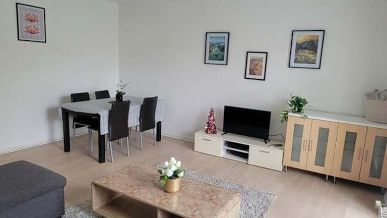 Die Ferienwohnung umfasst ein Schlafzimmer, ein Wohnzimmer sowie eine voll ausgestattete Küche, die mit einem Kühlschrank und einer Kaffeemaschine ausgestattet ist. Das Badezimmer verfügt über eine Badewanne und einen Haartrockner. Handtücher und Bettwäsche werden in der Unterkunft bereitgestellt.