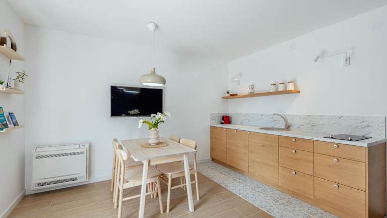Die Ferienwohnung verfügt über 1 Schlafzimmer, ein Wohnzimmer und eine voll ausgestattete Küche mit Kühlschrank und Kaffeemaschine. Das Badezimmer ist mit einer Dusche und kostenlosen Pflegeprodukten ausgestattet. Handtücher und Bettwäsche werden bereitgestellt.