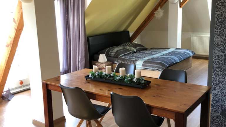 Die Maisonette-Wohnung mit Blick über die Stadt liegt in Jena, nur wenige Gehminuten von verschiedenen Attraktionen entfernt. Die Goethe-Gedenkstätte, der JenTower und die Universität Jena sind alle in der Nähe. Auch das Theaterhaus Jena und der Bahnhof Jena Paradies sind gut erreichbar. In der Umgebung gibt es viele weitere Sehenswürdigkeiten wie das Zeiss Planetarium, das Optische Museum Jena und das Schiller's Garden House. Der nächstgelegene Flughafen ist der Flughafen Erfurt-Weimar, der etwa 54 km entfernt liegt.