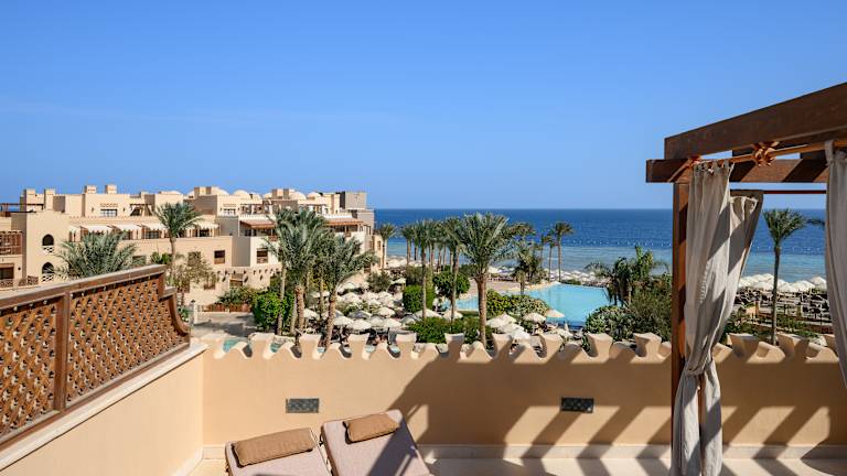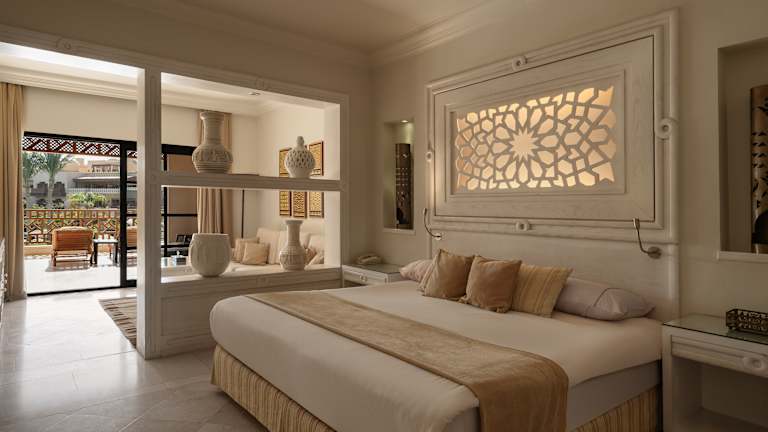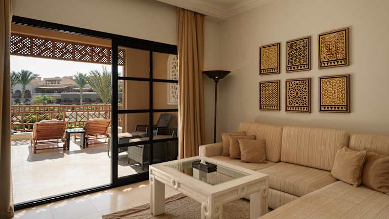 Die insgesamt 282 eleganten Zimmer verteilen sich auf 5 Etagen. Die Juniorsuiten (DZJ/EZJ) verfügen über Bad/Dusche, WC, Föhn, Klimaanlage (saisonal), LCD Flatscreen mit Sat. TV, Safe, Telefon, Minibar (Softdrinks inklusive), Kaffee-/Teezubereiter und Balkon/Terrasse sowie eine separate Sitzecke und haben seitlichen Meer-, Pool- oder Gartenblick. Alle Zimmer verfügen über Kingsizebetten. Die Poolsuite (DSU) hat zusätzlich einen privaten Pool auf der Terrasse.