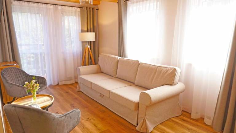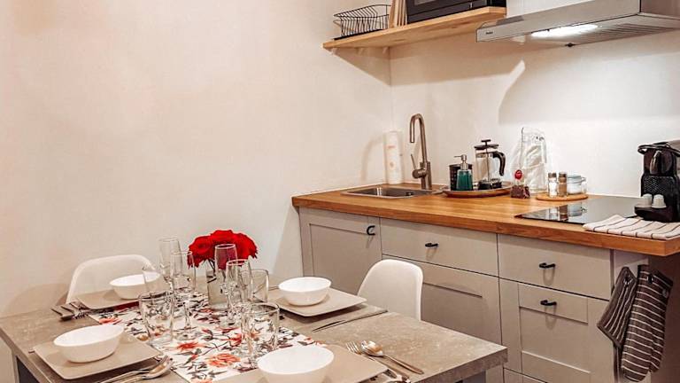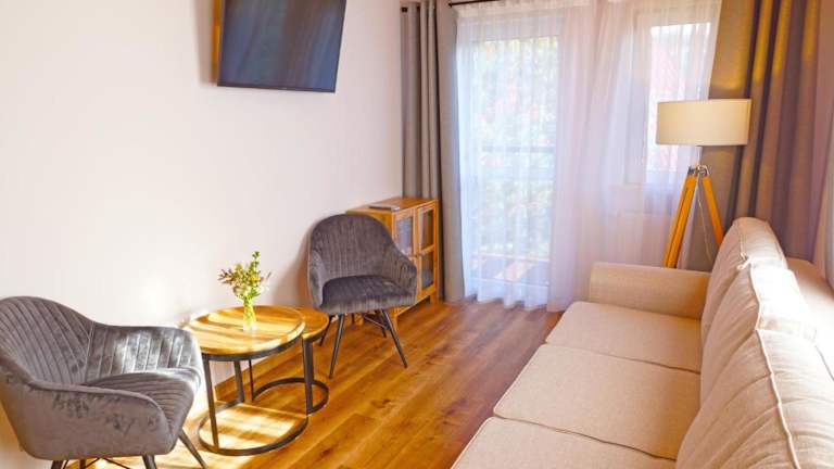 Die Wohneinheiten sind mit Parkettböden ausgestattet und verfügen über eine voll ausgestattete Küchenzeile, einen Essbereich und einen Flachbild-TV mit Satellitenkanälen. Des Weiteren sind ein eigenes Badezimmer mit Dusche und Haartrockner vorhanden. Einige Wohneinheiten bieten zudem einen Sitzbereich und/oder einen Balkon.