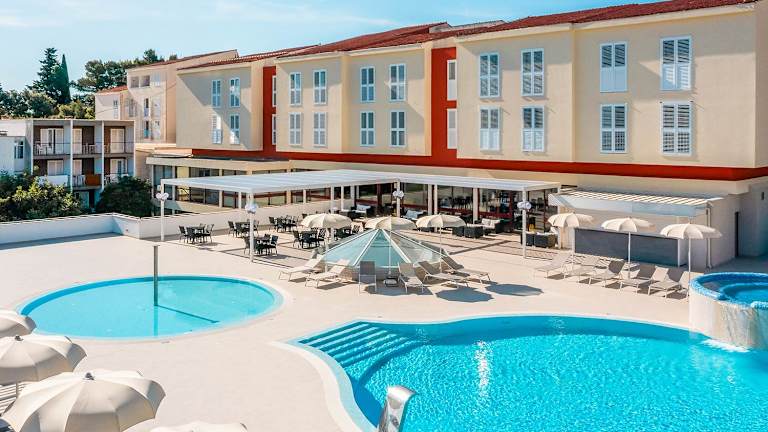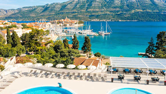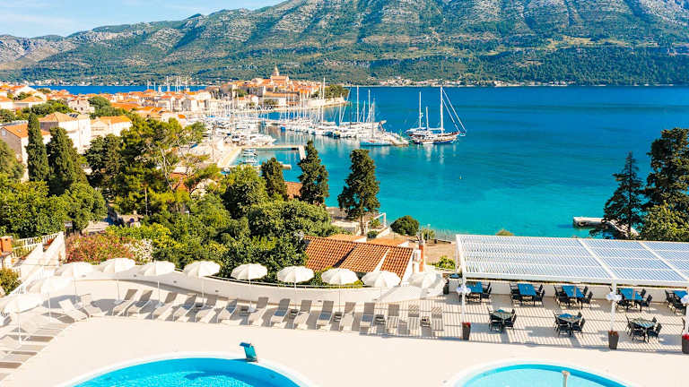 Korčula zum Greifen nah. Marko Polo Maradiso Hotel by Aminess bringt Ihnen Korčula zum Greifen nah. Der historische Stadtkern ist nur wenige Gehminuten entfernt, die Strände liegen noch näher. Und wenn Sie müde oder einfach nur entspannt sind – der Pool auf der Terrasse steht immer bereit, umgeben von Liegen und Sonnenschirmen. Ziehen Sie die Schuhe aus, genießen Sie die Begrüßungssüßigkeit, atmen Sie tief durch. Ihr Urlaub hat begonnen.