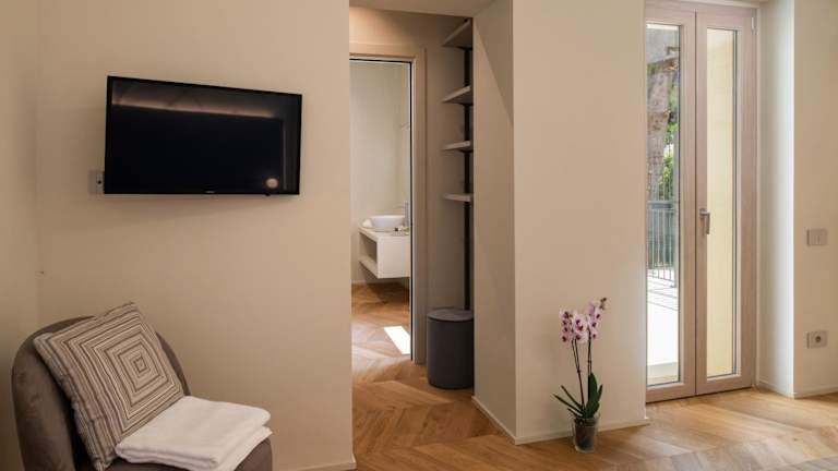 Jede Wohneinheit verfügt über ein eigenes Badezimmer mit Bidet, Klimaanlage, Flachbild-TV und Kühlschrank. Das Bad ist voll ausgestattet, mit einer Dusche und kostenlosen Pflegeprodukten.