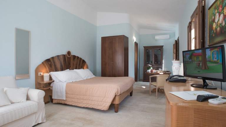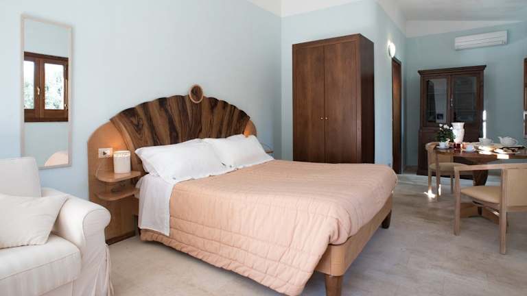 Die Zimmer im Masseria Pizzofalcone sind im typisch mediterranen Stil eingerichtet und bieten eine gemütliche und authentische Atmosphäre. Die Zimmer verfügen über Gewölbedecken, freiliegende Steinwände und Böden aus Lecce-Stein. Die handwerklich hergestellten Betten bestehen aus Oliven- und Ahornholz und sorgen für einen erholsamen Schlaf.