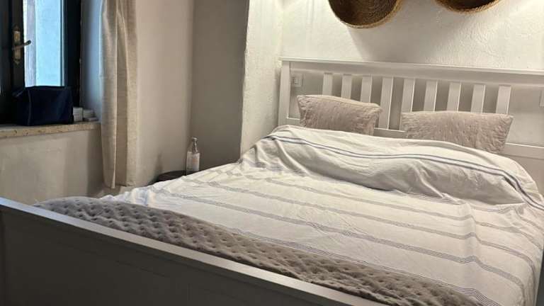 Das klimatisierte Ferienhaus verfügt über zwei Schlafzimmer, ein Wohnzimmer und eine voll ausgestattete Küche mit Kühlschrank und Kaffeemaschine. Es sind außerdem ein Badezimmer mit Bidet und Dusche sowie Handtücher und Bettwäsche vorhanden.