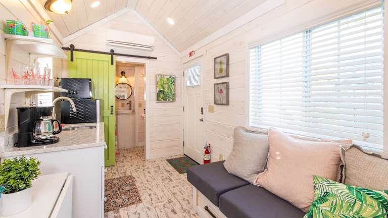 Die Unterkunft im Matlacha Tiny Village besteht aus einem Ferienhaus mit Meerblick. Das Ferienhaus verfügt über eine Terrasse, auf der Sie die schöne Aussicht genießen können. Im Inneren finden Sie einen gemütlichen Sitzbereich und einen Flachbild-TV. Die voll ausgestattete Küchenzeile bietet alles, was Sie für die Zubereitung Ihrer Mahlzeiten benötigen, einschließlich eines Kühlschranks, einer Mikrowelle, eines Kochfelds und einer Kaffeemaschine. Das private Badezimmer ist mit einer Dusche ausgestattet.