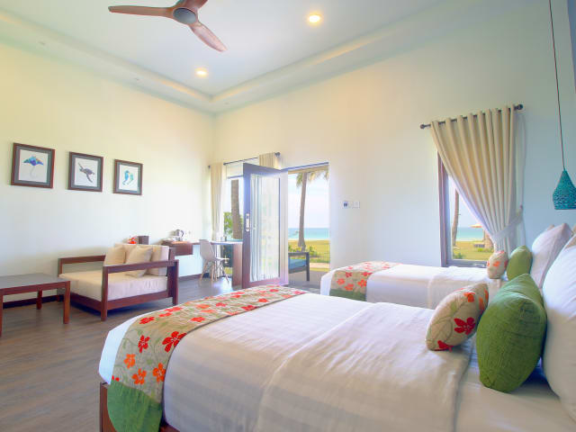 Die klimatisierten Chalets im Mayang Sari Beach Resort sind im Stil eines balinesischen Dorfes gestaltet und bieten eine gemütliche und komfortable Unterkunft. Jedes Chalet verfügt über ein Tagesbett und Tee- und Kaffeezubehör. Das eigene Bad ist mit einer Dusche ausgestattet. Die Chalets bieten auch einen atemberaubenden Blick auf den Garten oder das Meer.