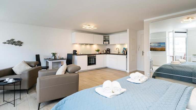 Die Ferienwohnung umfasst einen Balkon mit Meerblick, einen Flachbild-TV sowie eine gut ausgestattete Küche mit einem Kühlschrank, Geschirrspüler und Ofen. Des Weiteren bietet die Unterkunft ein Badezimmer mit Dusche und Haartrockner. Haustiere sind erlaubt, jedoch könnten dafür Gebühren anfallen.