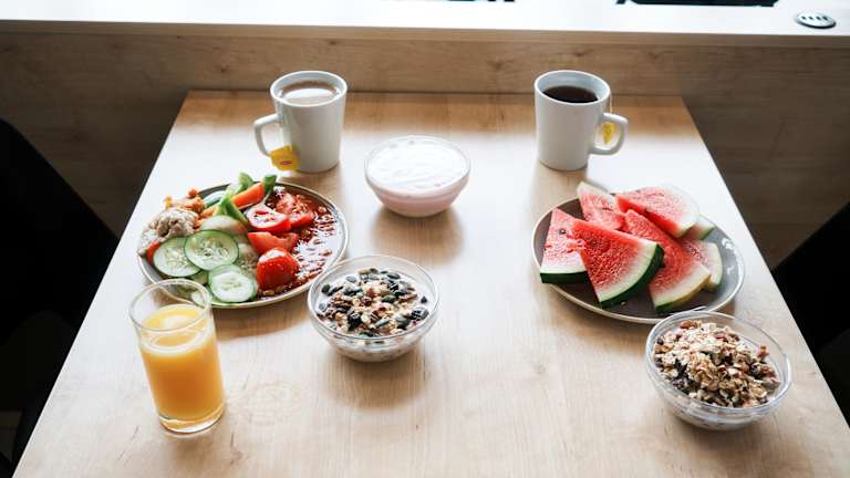 Morgens wird ein reichhaltiges Frühstück To Go geboten. Gegen eine geringe Gebühr sind auch Lunchpakete erhältlich. In unmittelbarer Umgebung gibt es neben der Großen Markthalle auch zahlreiche Restaurants.