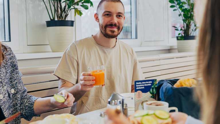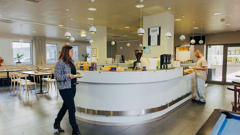 Unser reichhaltiges Frühstücksbuffet To Go ist der ideale Start in den Tag und gegen einen kleinen Aufpreis erhältlich. An unserem Snackautomaten kann man jederzeit Kleinigkeiten zum Essen kaufen.