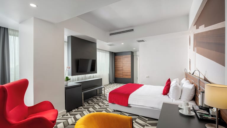 Das Hotel Mercure Bucharest Unirii bietet eine warme und moderne Unterkunft im Herzen von Bukarest. Die Zimmer sind komfortabel und mit Klimaanlage und Minibar ausgestattet. Gäste können die Altstadt sowie das Einkaufs- und Unterhaltungsviertel von Bukarest bequem zu Fuß erkunden. Das Hotel bietet ein reichhaltiges Frühstücksbuffet und eine Lobbybar, die verschiedene Getränke serviert. Kostenloses WLAN und kostenlose Parkplätze stehen zur Verfügung.
