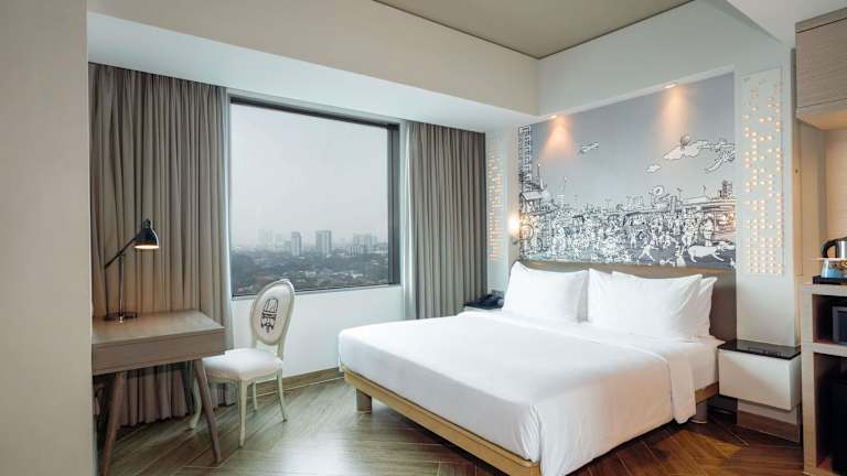 Das Mercure Jakarta Simatupang verfügt über 232 Zimmer, die auf 18 Etagen verteilt sind. Die Zimmer sind modern gestaltet und bieten komfortable Annehmlichkeiten wie eine Klimaanlage, einen Safe, eine Minibar und eine Kaffeemaschine. WLAN ist im gesamten Hotel kostenlos verfügbar. Im Badezimmer finden Sie eine Dusche, kostenfreie Pflegeprodukte, Hausschuhe und einen Haartrockner.