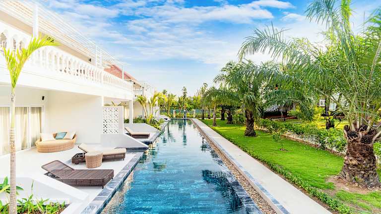 Die elegant eingerichteten Villen der Pension bieten Ihnen allen Komfort, den Sie für einen erholsamen Aufenthalt benötigen. Jede Villa verfügt über klimatisierte Zimmer mit einem Kleiderschrank, einem Safe, einer Minibar, einem Flachbild-Kabel-TV und einem gemütlichen Sitzbereich. Im eigenen Bad finden Sie eine Dusche, einen Haartrockner, Hausschuhe und kostenfreie Pflegeprodukte.