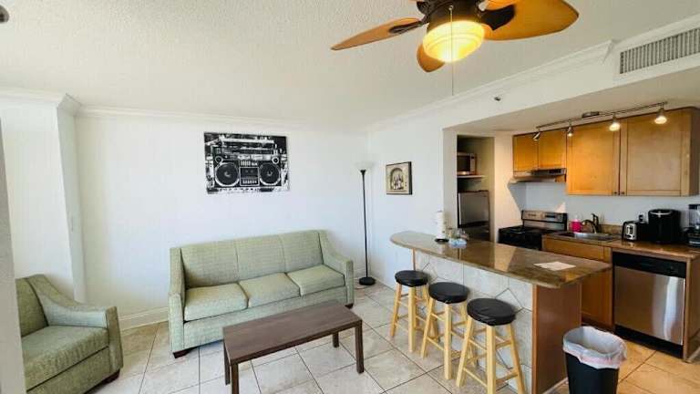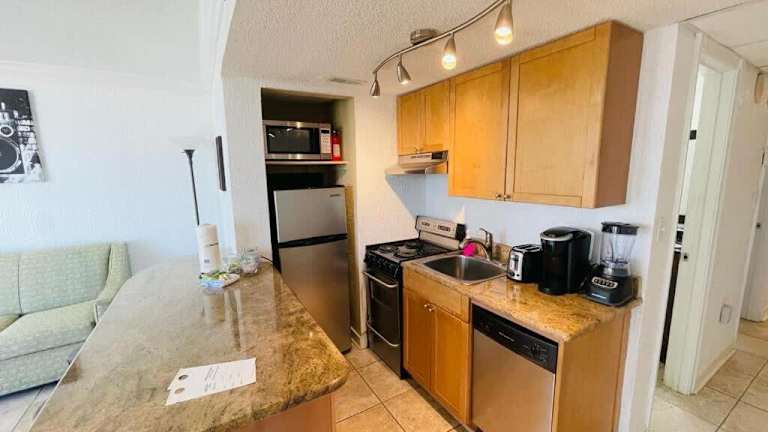 Das Apartment im Oceanfront Condo Steps to the Beach w No Resort Fees verfügt über 1 Schlafzimmer, ein Wohnzimmer und ein Badezimmer mit Dusche und Badewanne. Ein Balkon mit Meerblick lädt zum Entspannen ein. Zur Ausstattung gehören auch ein Flachbild-Kabel-TV und eine voll ausgestattete Küche. Handtücher und Bettwäsche werden gestellt.