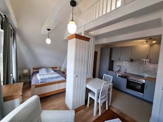 Die Ferienwohnung ist mit einem Satelliten-Flachbild-TV und einem Wohnzimmer ausgestattet. Zur Küchenzeile gehören ein Kühlschrank, ein Geschirrspüler, ein Ofen, eine Kaffeemaschine und ein Wasserkocher.