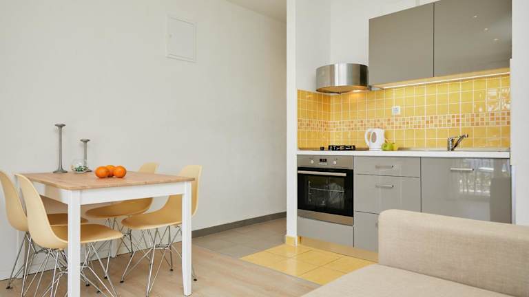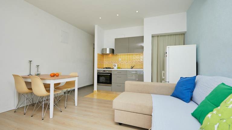 Die Ferienwohnung verfügt über einen Balkon mit Meerblick, ein Schlafzimmer, ein Wohnzimmer, einen Satelliten-Flachbild-TV, eine gut ausgestattete Küche sowie ein Badezimmer mit Dusche und Badewanne. Handtücher und Bettwäsche werden bereitgestellt. Zudem steht eine Terrasse zur Verfügung.