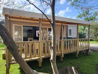 Die Mobilheime sind für 5 Personen ausgelegt und bieten eine voll ausgestattete Küchenzeile mit Kaffeemaschine, Kühlschrank, Mikrowelle, Toaster und Wasserkocher. Die Unterkunft verfügt über ein Wohnzimmer mit TV und ein eigenes Badezimmer mit Haartrockner und Dusche. Klimaanlage ist ebenfalls vorhanden.