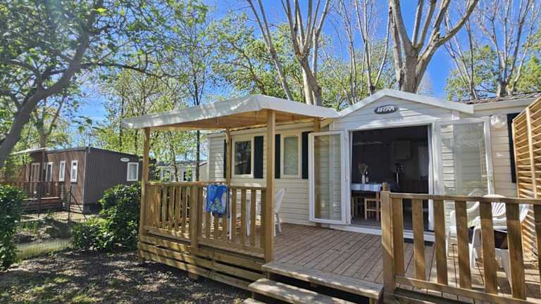 Das Mobil Home bietet Platz für bis zu sechs Personen. Es verfügt über einen Garten mit Blick auf die Umgebung und eine Terrasse. Zu den Annehmlichkeiten zählt ein saisonaler Außenpool sowie ein Kinderspielplatz.
