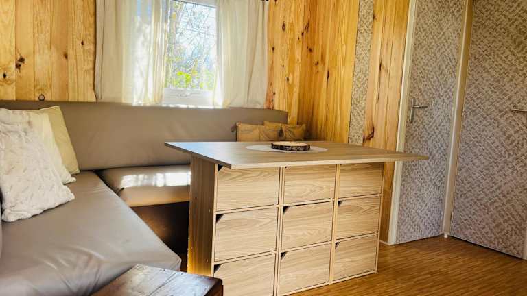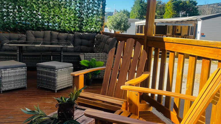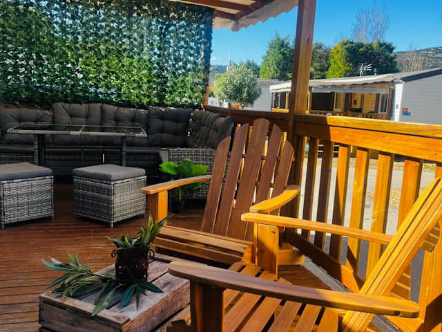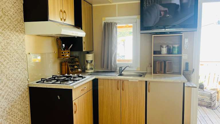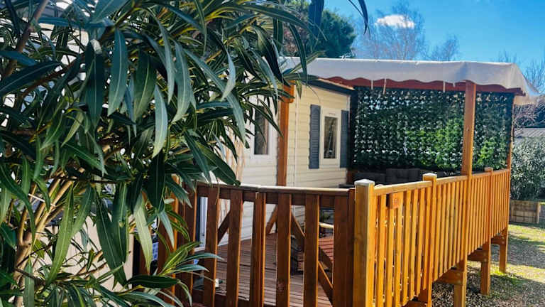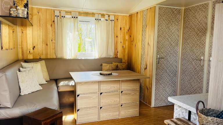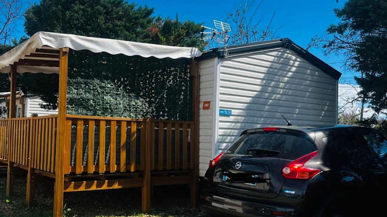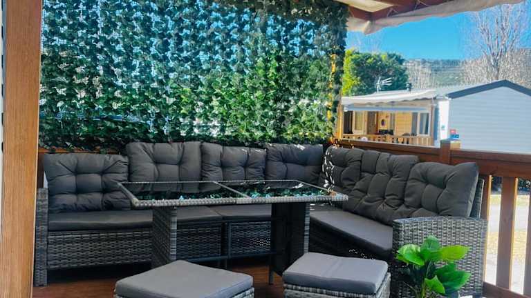 Mobil-Home Cosy Climatisé 3 chambres bietet eine komfortable Unterkunft mit einem saisonalen Außenpool, einem Garten und einem Kinderclub. Die Ausstattung umfasst eine Terrasse sowie einen Sitzbereich und Flachbild-TV.