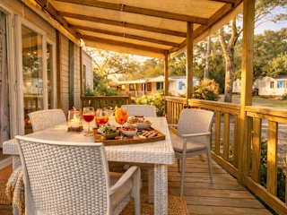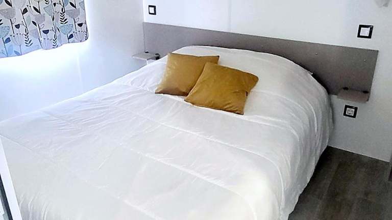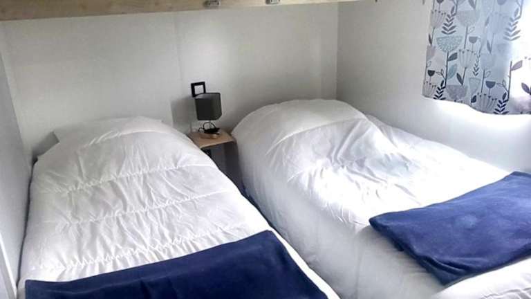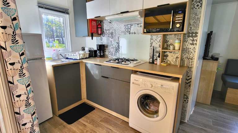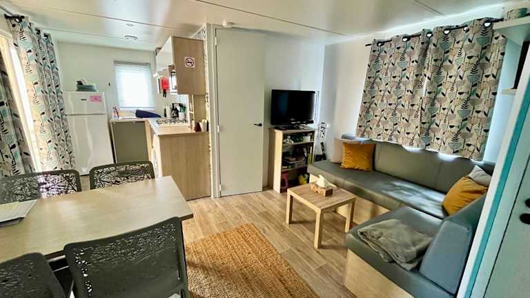 Die Mobilheime sind für 5 Personen ausgelegt und bieten eine voll ausgestattete Küchenzeile mit Kaffeemaschine, Kühlschrank, Mikrowelle, Toaster und Wasserkocher. Die Unterkunft verfügt über ein Wohnzimmer mit TV und ein eigenes Badezimmer mit Haartrockner und Dusche. Klimaanlage ist ebenfalls vorhanden.