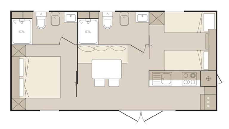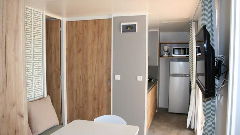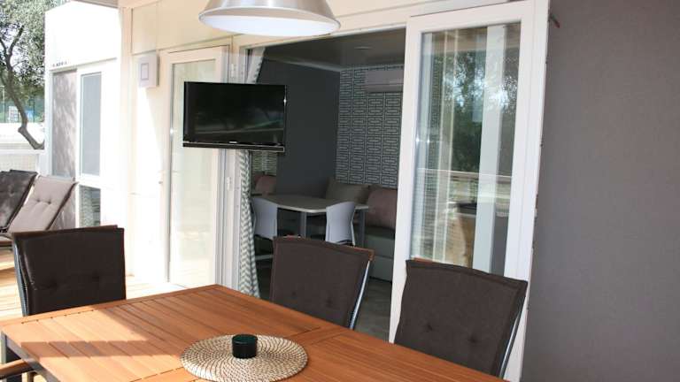 Die mobilen Ferienhäuser sind mit einem Sitzbereich, einem Satelliten Flachbild-TV und einem eigenen Badezimmer mit Dusche und Haartrockner ausgestattet.