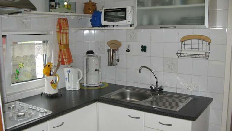 Die Küchenzeile im Mobilheim ist ausgestattet mit einem Kühlschrank, einer Mikrowelle, einer Herdplatte und einem Wasserkocher, um die Zubereitung von Mahlzeiten zu ermöglichen.