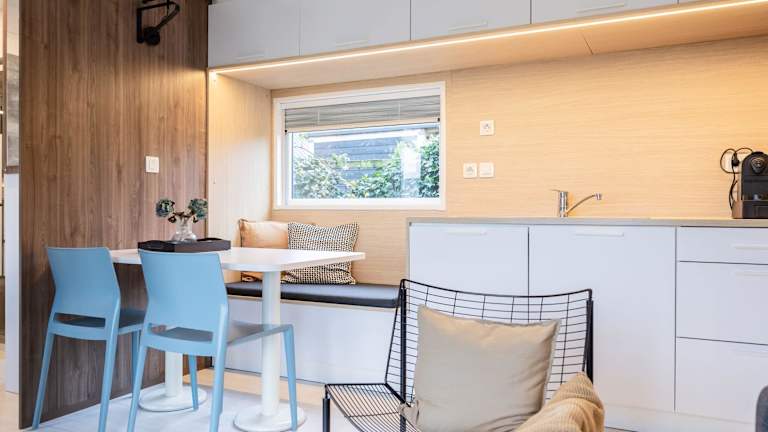 Das Chalet verfügt über zwei Schlafzimmer und ist mit Kabel TV ausgestattet. Die moderne Küche beinhaltet einen Kühlschrank und einen Geschirrspüler, was eine komfortable Selbstversorgung ermöglicht.
