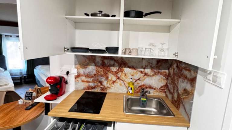 Das Modern Studio N9 Kitchenette Bathroom bietet eine zeitgemäße Unterkunft mit Annehmlichkeiten wie Klimaanlage und gratis WLAN in der gesamten Einrichtung. Die Ferienwohnung verfügt über einen Wohnbereich mit einem Flachbild-TV und eine Küchenzeile für die Zubereitung von Mahlzeiten.