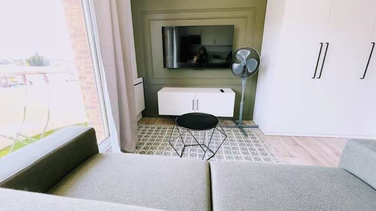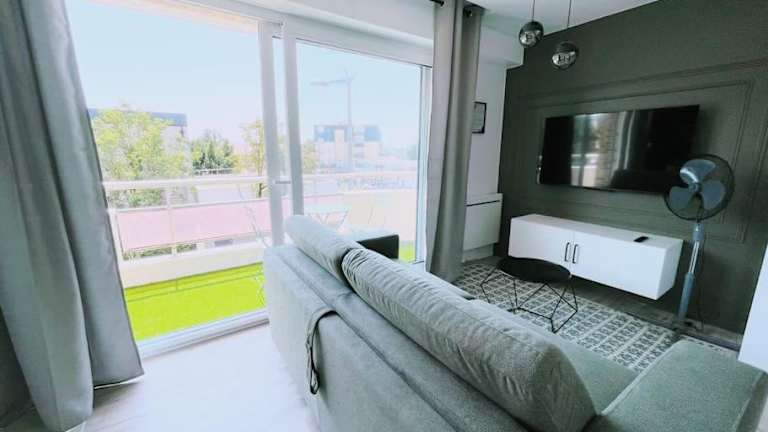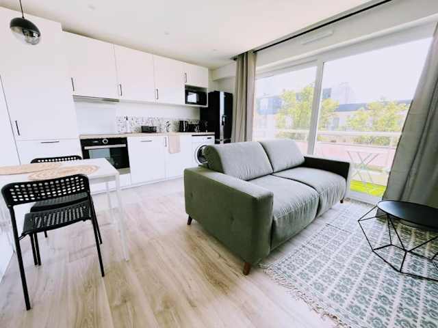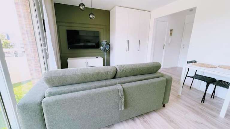 Die Ferienwohnung besteht aus 1 Schlafzimmer und ist mit einer Küche ausgestattet, die einen Kühlschrank und einen Geschirrspüler umfasst. Zudem sind ein Flachbild-TV, ein Sitzbereich und ein Badezimmer mit Dusche vorhanden. Ein Balkon ist ebenfalls Teil der Unterkunft.