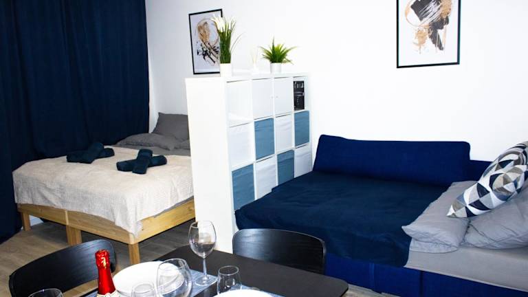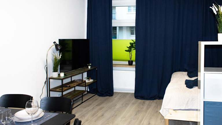 Das Apartment verfügt über ein Schlafzimmer, eine Küche, die mit einem Kühlschrank und einem Geschirrspüler ausgestattet ist, sowie über einen Flachbild-TV und einen Sitzbereich. Das Badezimmer ist mit einer Dusche ausgestattet.
