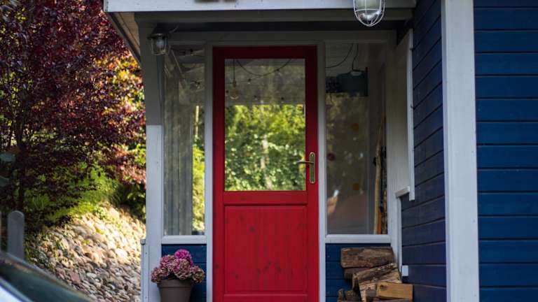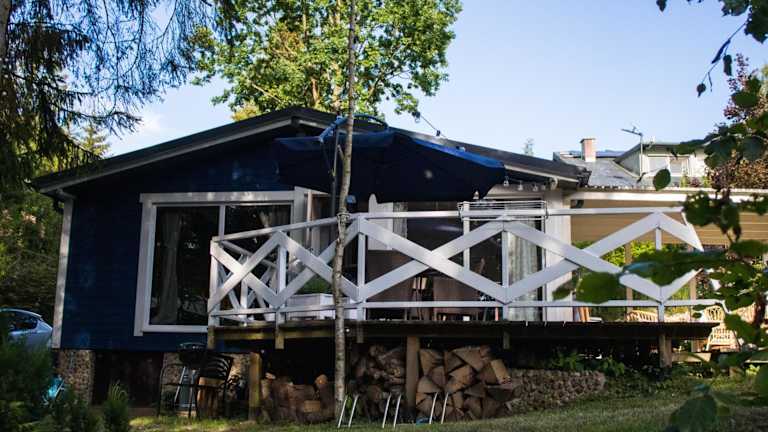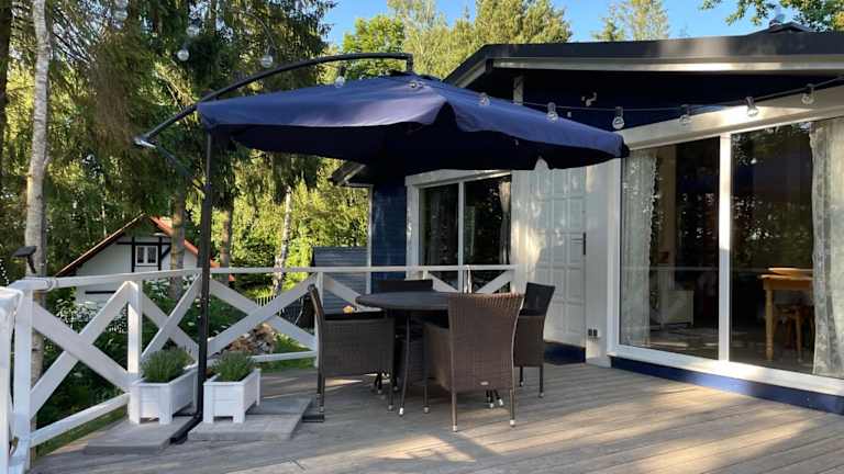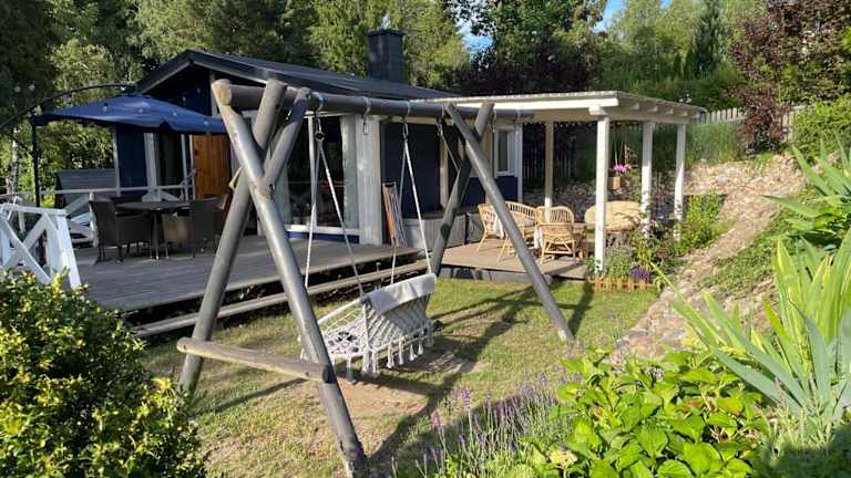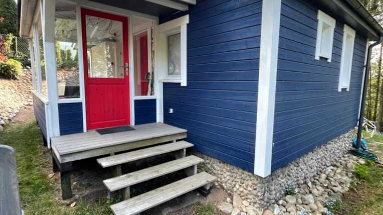Modry Domek Sznurki Całoroczny Ogrodzony bietet Übernachtungsmöglichkeiten in einem Ferienhaus mit einem Garten, kostenlosem WLAN und einer Gemeinschaftsküche. Die Unterkunft verfügt über einen kostenlosen Privatparkplatz und eine Terrasse.