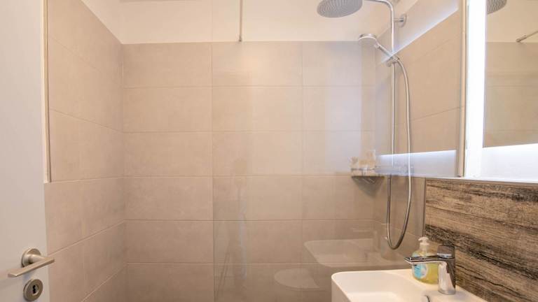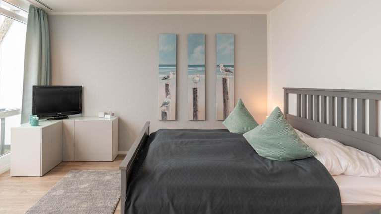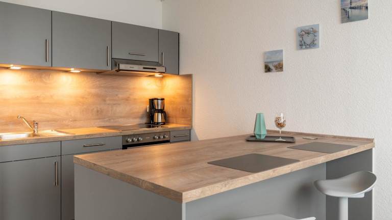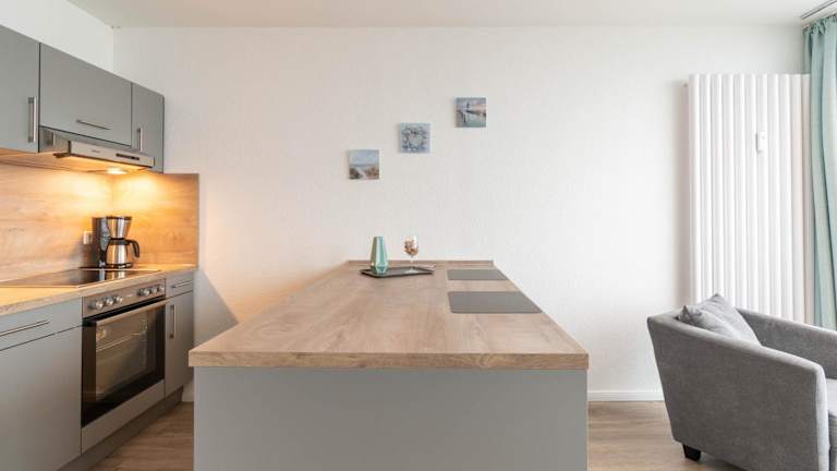 Die Ferienwohnung ist ausgestattet mit einem Flachbild-TV. Die Küchenzeile ist mit einem Kühlschrank, Geschirrspüler, Ofen, Kaffeemaschine und Wasserkocher eingerichtet.