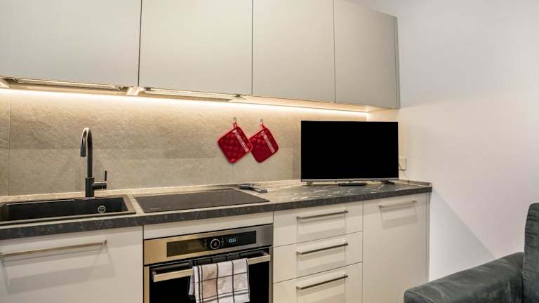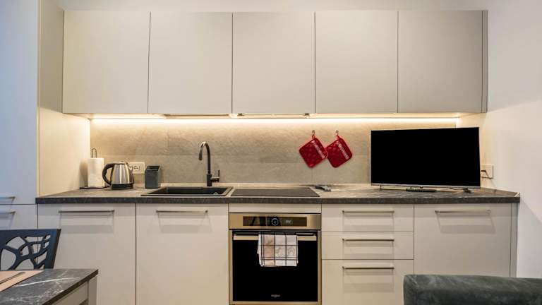 Die Ferienwohnung ist mit einem Kabel-TV ausgestattet und bietet eine gut ausgestattete Küche mit Kühlschrank, Geschirrspüler und Ofen. Ein Badezimmer mit Dusche sowie kostenlose Pflegeprodukte und ein Haartrockner sind ebenfalls vorhanden.