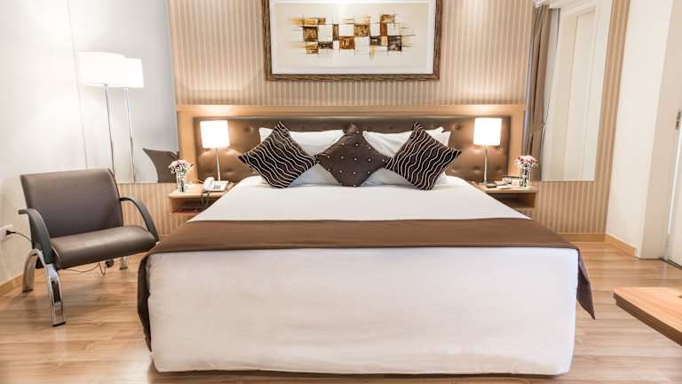 Die Zimmer sind mit einer Klimaanlage und einem Doppelbett sowie einem Sofabett ausgestattet. Zu den Annehmlichkeiten gehören ein Minikühlschrank, eine Minibar, ein Safe, ein Schreibtisch und ein TV-Gerät mit Satelliten-/Kabelempfang. Die Badezimmer bieten eine Dusche, eine Badewanne und Kosmetikartikel. Es sind auch rollstuhlgerechte Zimmer verfügbar.