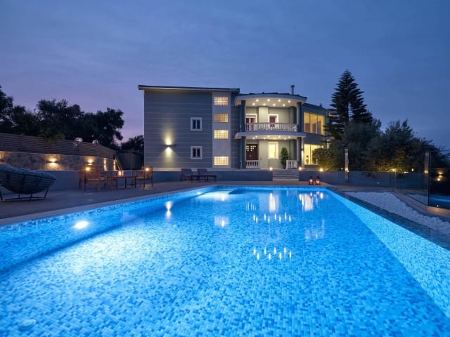 Erleben Sie einen unvergesslichen Aufenthalt in der Mont Bleu Luxury Villa in Zakynthos-Stadt. Genießen Sie den Luxus eines eigenen Pools, einer Terrasse und atemberaubendem Meerblick. Das Hotel bietet Ihnen einen kostenfreien Transfer und einen privaten Chauffeur. Entspannen Sie im Spa- und Wellnesscenter mit Whirlpool, Sauna und Fitnesscenter. Die Villa verfügt über 5 stilvoll eingerichtete Schlafzimmer und eine voll ausgestattete Küche. Lassen Sie sich von Ihrem eigenen Koch mit einem köstlichen Frühstück verwöhnen. Im Außenbereich finden Sie einen Pool und einen Grill. Erkunden Sie die Umgebung und besuchen Sie den Platz Dionisios Solomos und den Hafen von Zakynthos.
