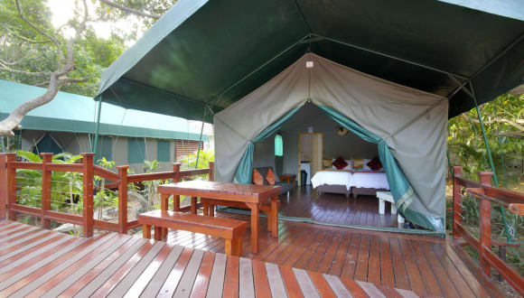 Die Zelt-Lodges im Luxury Tented Village @ Urban Glamping bieten den Komfort und die Privatsphäre eines eigenen Zimmers. Jedes Zelt verfügt über einen Kleiderschrank, einen Kühlschrank und ein eigenes Bad mit Dusche. Die Zelte sind auf Holzterrassen mit einem gemütlichen Sitzbereich platziert, von dem aus Sie die Umgebung genießen können.