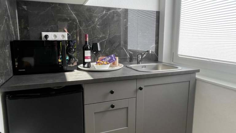 In der Ferienwohnung steht eine komplett ausgestattete Küche zur Verfügung, die einen Kühlschrank und eine Mikrowelle beinhaltet. Es ist auch möglich, Essen in die Unterkunft liefern zu lassen. Weitere Verpflegungsmöglichkeiten sind in der Umgebung des Apartments zu finden.