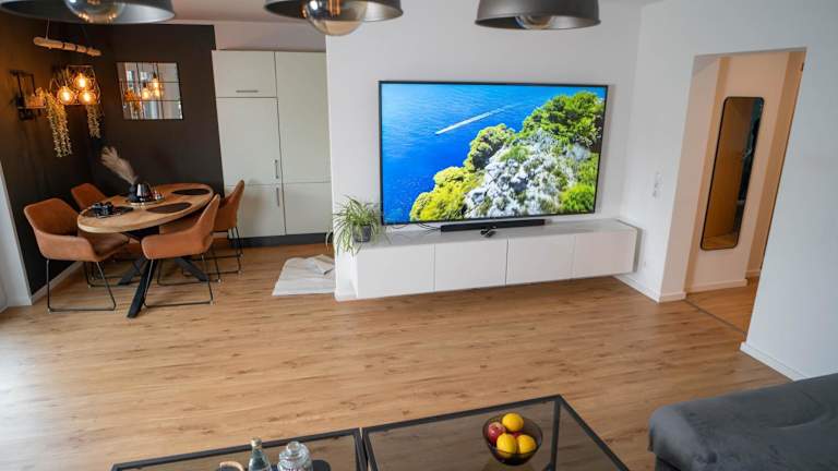 Die Ferienwohnung umfasst 2 Schlafzimmer, ein Wohnzimmer, einen Flachbild-TV sowie eine gut ausgestattete Küche, die mit einem Kühlschrank und einem Geschirrspüler ausgestattet ist. Ein Badezimmer mit Dusche sowie Handtücher und Bettwäsche stehen zur Verfügung.