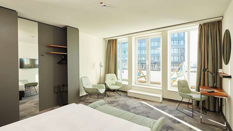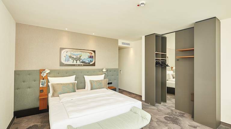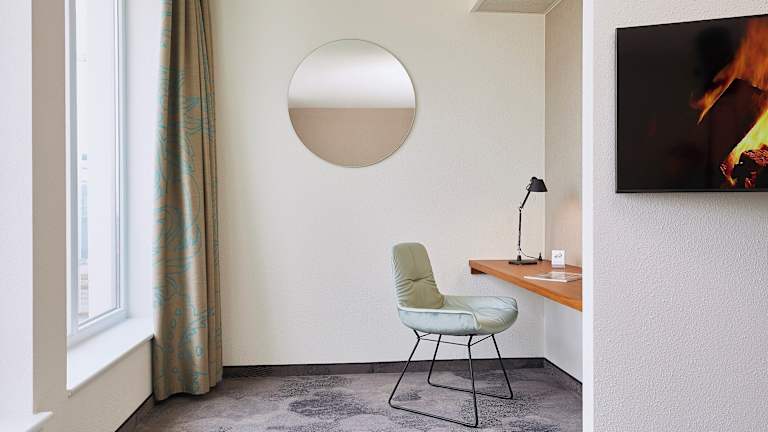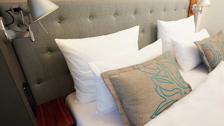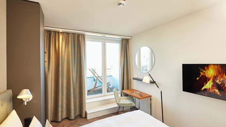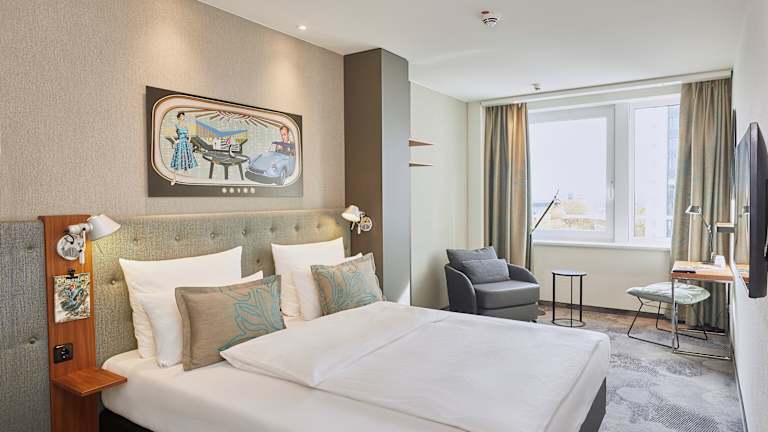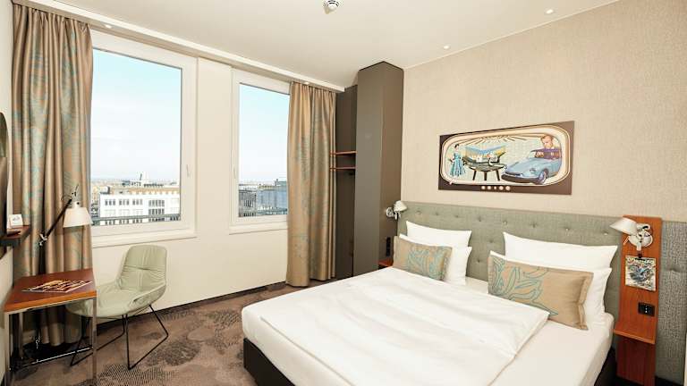 Die Zimmer des Motel One Essen sind im frischen, funktionalen Look designt und verfügen über ein bequemes Doppelbett, einen mobilen Arbeitsplatz mit W-LAN Zugang, Sessel sowie Klimaanlage. Markenhighlights wie ein LOEWE-Flachbildfernseher, Leuchten des mehrfach ausgezeichneten Herstellers ARTEMIDE sowie hochwertige Materialien und Textilien in allen Bereichen runden das Zimmerkonzept ab. Waschtischarmaturen der Designmarke Dornbracht sowie eine Raindance Dusche von Hansgrohe ergänzen die voll ausgestatteten Badezimmer, die sich in weißen Tönen und dunklem Granit präsentieren. Darüber hinaus verfügen die Zimmer in der obersten Etage über Balkone, die einen weiten Ausblick auf die Stadt und ihre umliegenden Wahrzeichen erlauben, darunter die Schalker Arena und die Zeche Zollverein.