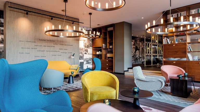 Das Herzstück des Hotels ist die großzügige „One Lounge“, die Lobby, Frühstücksraum und Bar in einem ist. Hier können die Gäste frühstücken, einen Snack genießen und rund um die Uhr den kostenfreien W-LAN Zugang des Hotels nutzen. Eine Bilderreihe des Essener Fotografen Horst Lang versetzt die Gäste zurück in die Zeit des deutschen Wirtschaftswunders. Die aus dessen Bildband stammenden Schwarzweißaufnahmen dokumentieren in einzigartiger Weise die Industrielandschaft ab Mitte der 50er Jahre. Ergänzt wird das nos-talgische Szenario durch originale Industrieleuchten sowie den Schriftzug „Glück auf“ hinter der Rezeption.