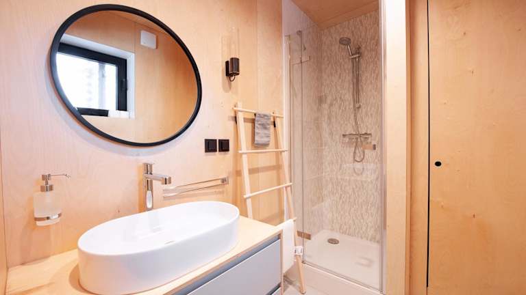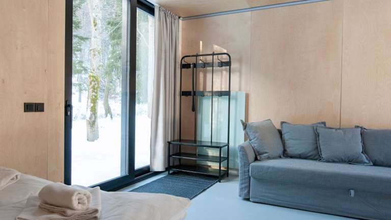 Die Mountain Cabin by the river - Base Camp Medvědín bietet eine Gemeinschaftslounge und eine Terrasse.